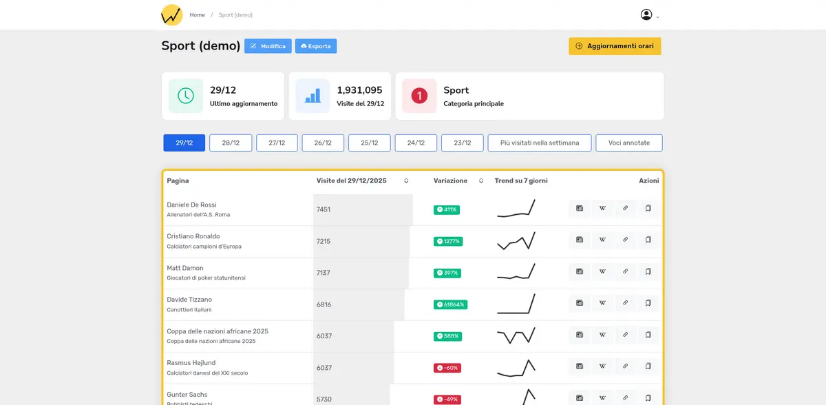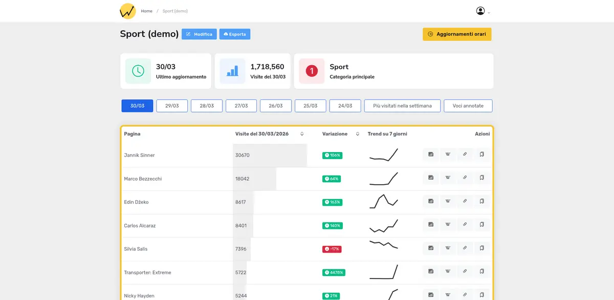 Scegliendo il piano "Redazione" avrai accesso agli aggiornamenti su base oraria del traffico che transita su Wikipedia in lingua italiana. Per intercettare i temi emergenti ancor prima che emergano, e stare costantemente sulla cresta dell'onda.
